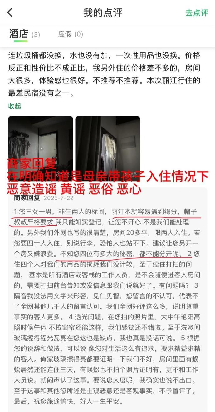 消费者称自己一个妈妈带三个孩子入住,商家回复称之为“三女一男”,并称“丽江本就容易遇到缘分”“不知四位有多大的秘密”,消费者认为该表述带有低俗暗示,感到被冒犯。