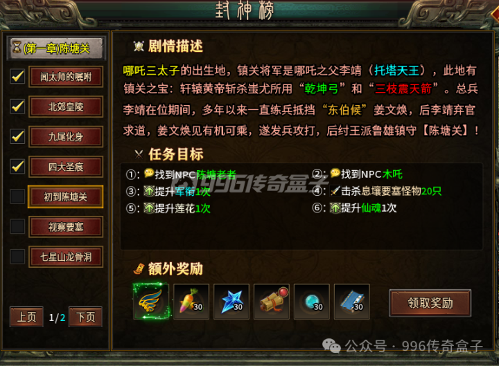 这个服还结合了一点封神的背景故事,是有主线任务的,跟着引导走就可以了!这个主线任务也就是上方的成长指引,每个章节都有好几个任务,每个任务下面又有好几个目标,挨个完成就就会有任务奖励!