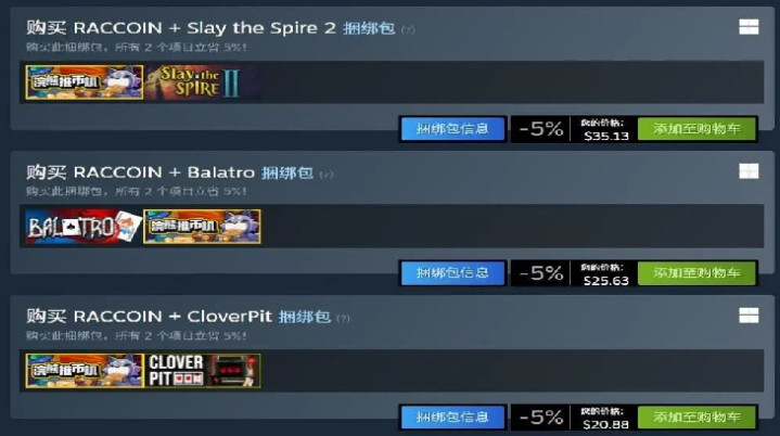 目前《浣熊推币机》已经和《Balatro》《杀戮尖塔2》《CloverPit》等产品推出捆绑包。这说明Playstack在发行时,并没有把它当成一个单独品类去卖,而是很清楚它真正要承接的是哪一批玩家:
