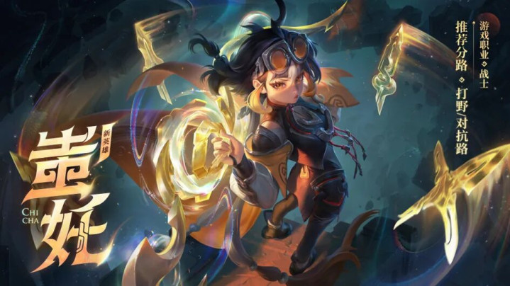 首先是新英雄上线,就是蚩奼,下图可能就是新英雄的海报。这个英雄会有两套语音,大家可以去听听看。