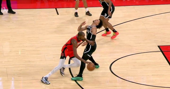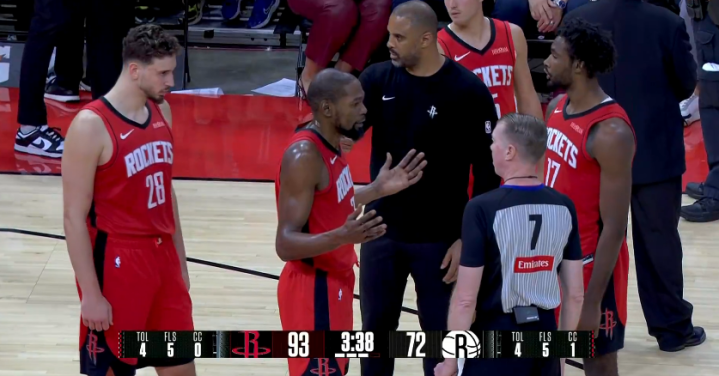 下半场,申京和小贾连续得分助火箭11-2领先到20分,面对篮网的反扑,杜兰特一挑四打成不讲理2+1,之后中投以及造犯规罚球得分,不过第三节3分38秒杜兰特持球打到威尔逊的面部,吃到进攻犯规后无奈摊手,火箭挑战失败,杜兰特继续找裁判理论也无济于事,吃到第4犯只能下场休息。