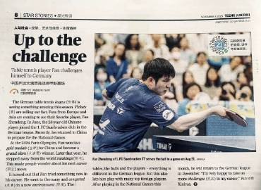 报道以“Uptothechallenge(迎接挑战)”与“Comingbackhome(归来)”为主题,讲述了樊振东在海外征战的经历——从初期的适应,到逐步融入、发挥领袖作用,再到如今回归国内赛场,全力备战全运会。
