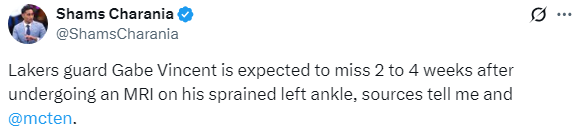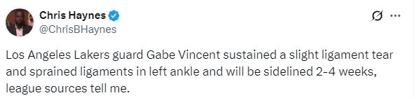 据名记Shams报道,湖人后卫文森特因左脚踝扭伤预计将缺阵2到4周;名记Chris Haynes补充报道,文森特左脚踝有韧带轻微撕裂。