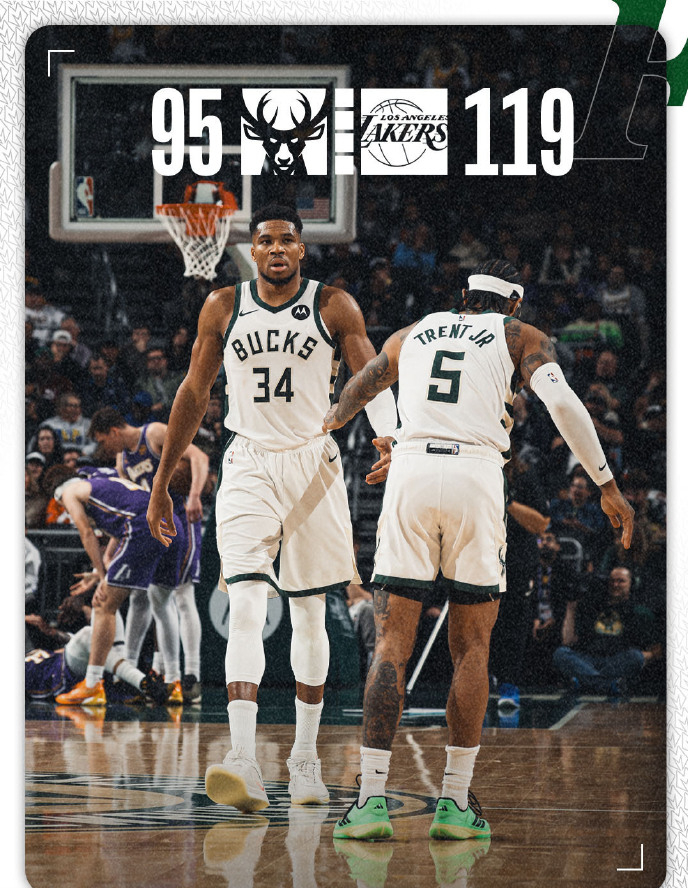 湖人今天以119-95击败雄鹿,以3胜2负的战绩结束了五连客之旅,战绩来到10胜4负,继续排在西部第四。而雄鹿战绩变成8胜6负,排名降至东部第七。